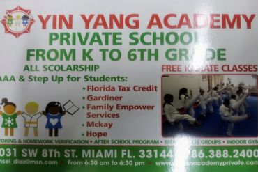 Yin Yang Academy is a local family ran Daycare and Private School. The Daycare accepts children Infants-VPK, teaching with the Creative Curriculum. We work together with the Early Learning Coalition to accept their government scholarships: School Readiness, VPK, and The Children's Trust. The Daycare has implemented Gold Strategies which is a student evaluation system. Yin Yang Academy private school is from Kinder-8th grade. Accepting the following government scholarships: Florida Tax Credit, Family Empowerment Service, HOPE, Family Empowerment Service Unique Abilities, Mckay. Unlike our competitors we offer smart technology filled classrooms, karate, art and ballet classes for all. We are open during Summer, Winter, and Spring Break. As well as offering an activity packed Summer Camp experience.
